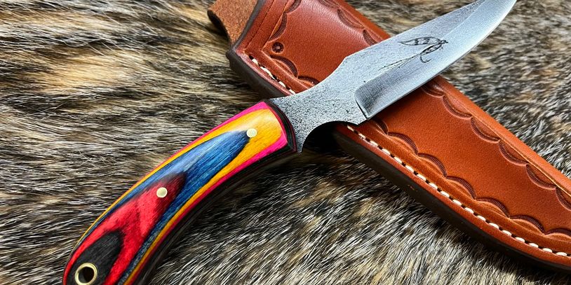 Full tang construction, L-6 steel (saw blade), drop point, 3 3/4" blade, 8 3/8" overall. Cocobolo wood scales with turquoise and blackwood spacers. The blade is embellished with a "Camo" pattern on the blade. Custom leather sheath. Guarantee card included.